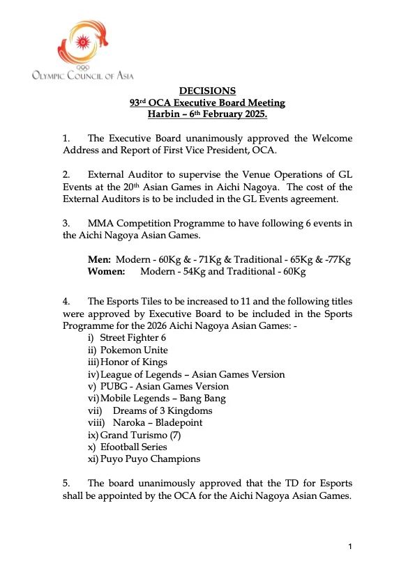 委員會(huì)還一致決定解散由OCA任命的、負(fù)責(zé)確定2026年愛(ài)知名古屋亞洲運(yùn)動(dòng)會(huì)電子競(jìng)技項(xiàng)目的工作組(Task Force),因?yàn)殡娮痈?jìng)技項(xiàng)目已由OCA執(zhí)行委員會(huì)批準(zhǔn)。