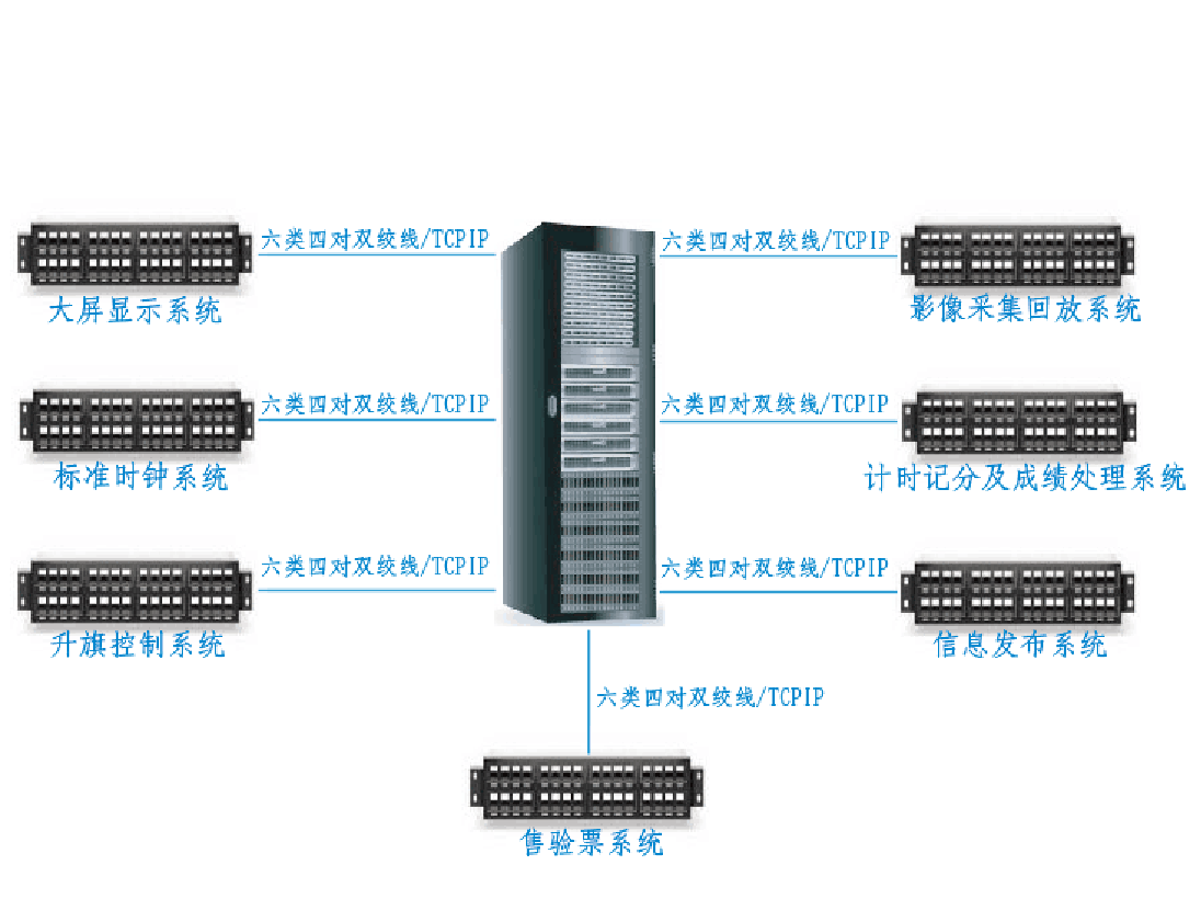 具有多種通信接口和支持多種通信協(xié)議,能方便、靈活地接入不同廠商、不同接口的系統(tǒng)和設(shè)備??梢詫?chǎng)館中具有開放接口的系統(tǒng)和設(shè)備直接集成到體育場(chǎng)館比賽設(shè)備集成系統(tǒng)中